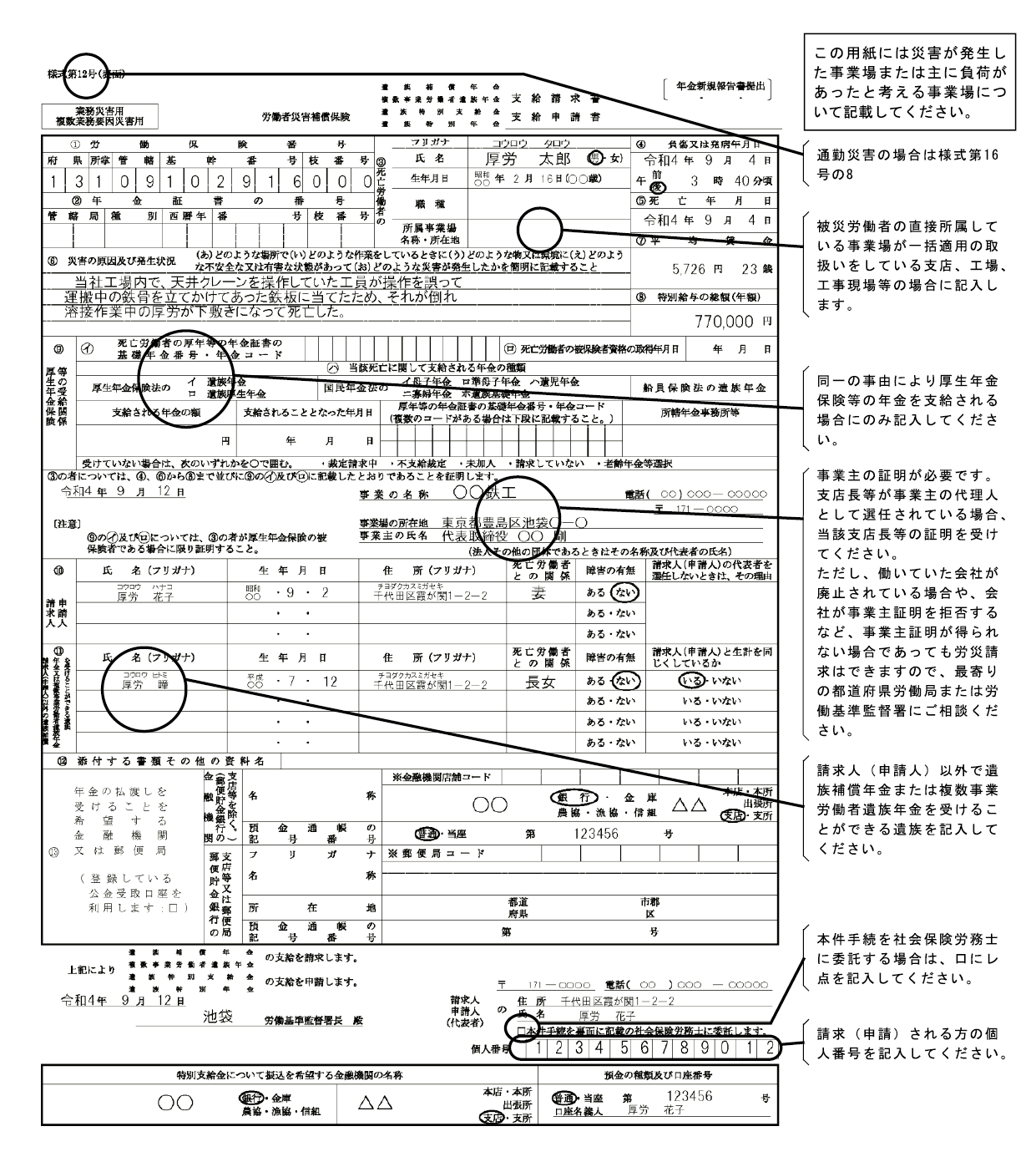 - 死亡した労働者について 氏名、生年月日、死亡年月日、職種などを正確に記入します 。職種は「配管作業員」「事務職員」など、作業内容が具体的にわかるように記載します 。