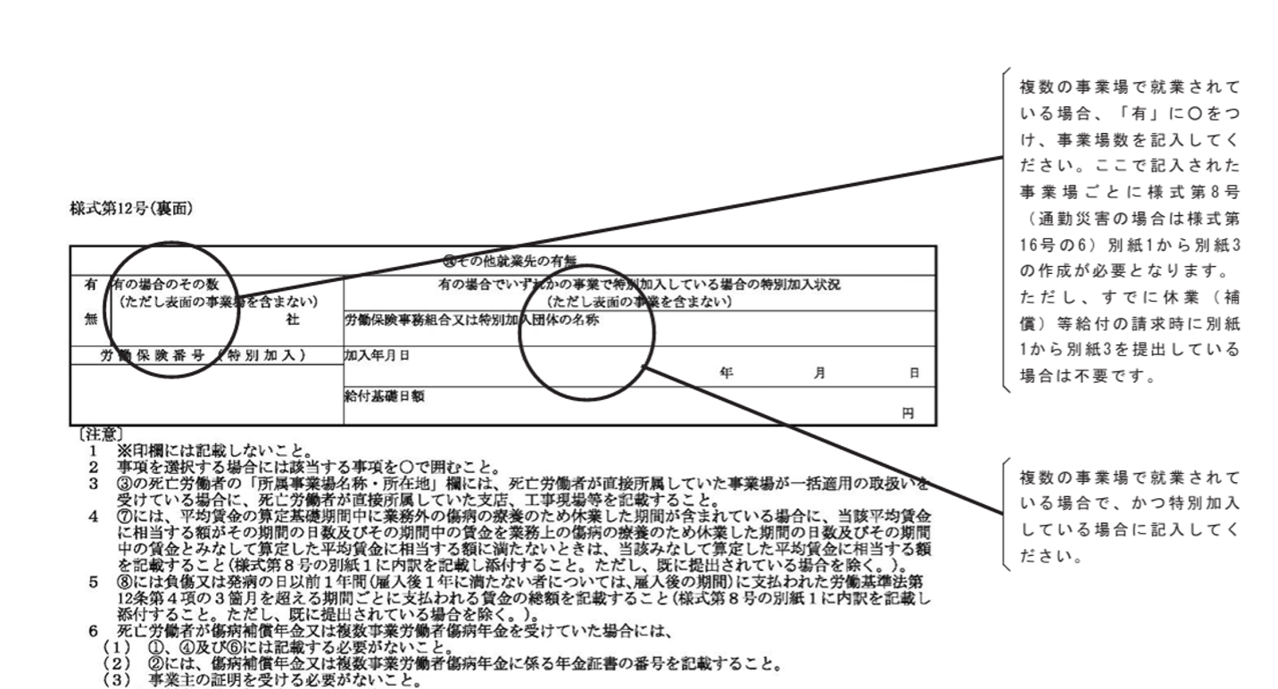 - 3の死亡労働者の「所属事業場名称・所在地」欄には、死亡労働者が直接所属していた事業場が一括適用の取扱いを受けている場合に、死亡労働者が直接所属していた支店、工事現場等を記載すること。