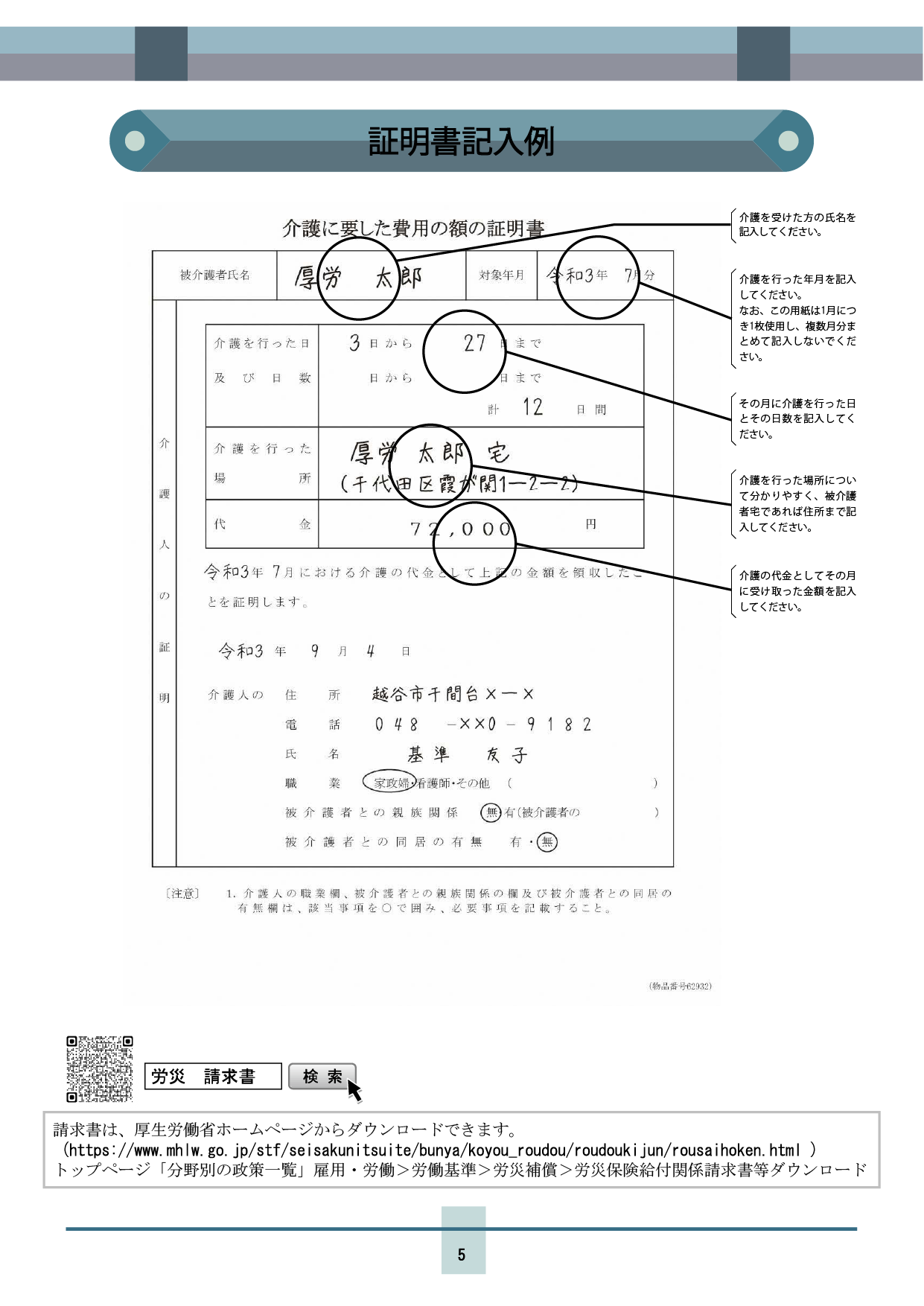 - 親族・知人による介護の場合 介護者の氏名、続柄、介護を受けた日数を記載します。実際に金銭の支払いがない場合は「費用額」は0円で構いません。この場合、介護の事実を証明するための申立書を添付することがあります。