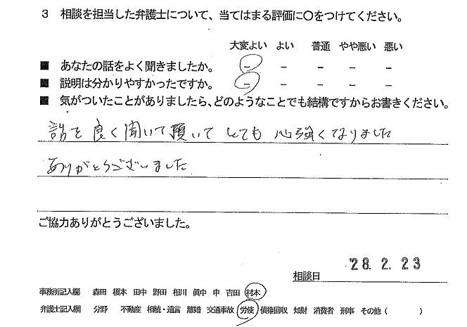 お客様の声(ご相談者の声)評判・口コミ 公開日:2016/03/02 お客様の声 ご相談者の声 話を良く聞いて頂いてとても心強くなりました。ありがとうございました。 ■あなたの話をよく聞きましたか:大変よい ■説明はわかりやすかったですか:大変よい 「お客様の声(ご相談者の声)評判・口コミ」 「お客様の声(ご相談者の声)評判・口コミ」