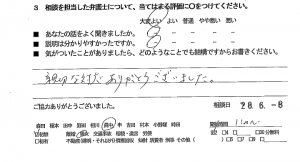 お客様の声(ご相談者の声)評判・口コミ 公開日:2016/07/20 お客様の声 ご相談者の声 親切な対応ありがとうございました。 ■あなたの話をよく聞きましたか:大変よい ■説明はわかりやすかったですか:大変よい 「お客様の声(ご相談者の声)評判・口コミ」 「お客様の声(ご相談者の声)評判・口コミ」