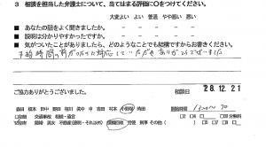 お客様の声(ご相談者の声)評判・口コミ 公開日:2017/01/17 お客様の声 ご相談者の声 予約時間の前だったのに対応していただきありがとうございました。 ■あなたの話をよく聞きましたか:一 ■説明はわかりやすかったですか:一 「お客様の声(ご相談者の声)評判・口コミ」 「お客様の声(ご相談者の声)評判・口コミ」