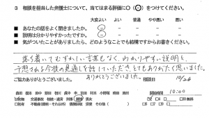 お客様の声(ご相談者の声)評判・口コミ 公開日:2018/11/24 お客様の声 ご相談者の声 落ち着いてむずかしい言葉もなく、わかりやすい説明と、予想される今後の見通しを説明していただき、とてもありがたく思いました。ありがとうございました。 ■あなたの話をよく聞きましたか:大変よい ■説明はわかりやすかったですか:大変よい 「お客様の声(ご依頼者の声)評判・口コミ」 「お客様の声(ご相談者の声)評判・口コミ」