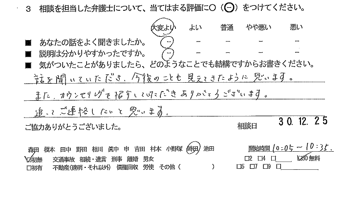 お客様の声(ご相談者の声)評判・口コミ 公開日:2019/01/09 お客様の声 ご相談者の声 話を聞いていただき、今後のことも見えてきたように思います。またカウンセリングを紹介していただきありがとうございます。追ってご連絡したいと思います。 ■あなたの話をよく聞きましたか:大変よい ■説明はわかりやすかったですか:大変よい 「お客様の声(ご相談者の声)評判・口コミ」 「お客様の声(ご相談者の声)評判・口コミ」