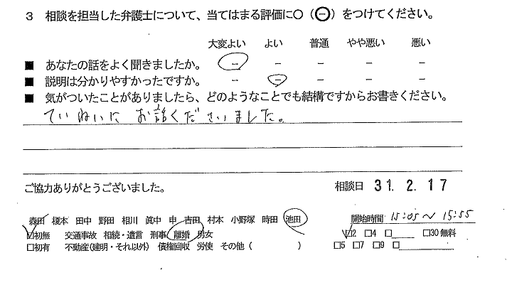 お客様の声(ご相談者の声)評判・口コミ 公開日:2019/03/14 お客様の声 ご相談者の声 ていねいにお話くださいました。 ■あなたの話をよく聞きましたか:大変よい ■説明はわかりやすかったですか:よい 「お客様の声(ご相談者の声)評判・口コミ」 「お客様の声(ご相談者の声)評判・口コミ」