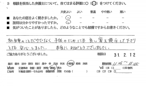 お客様の声(ご相談者の声)評判・口コミ 公開日:2019/03/08 お客様の声 ご相談者の声 私自身のことだけでなく子供のためにも良い案を提示して下さりとても安心しました。本当にありがとうございました。 ■あなたの話をよく聞きましたか:大変よい ■説明はわかりやすかったですか:大変よい 「お客様の声(ご相談者の声)評判・口コミ」 「お客様の声(ご相談者の声)評判・口コミ」