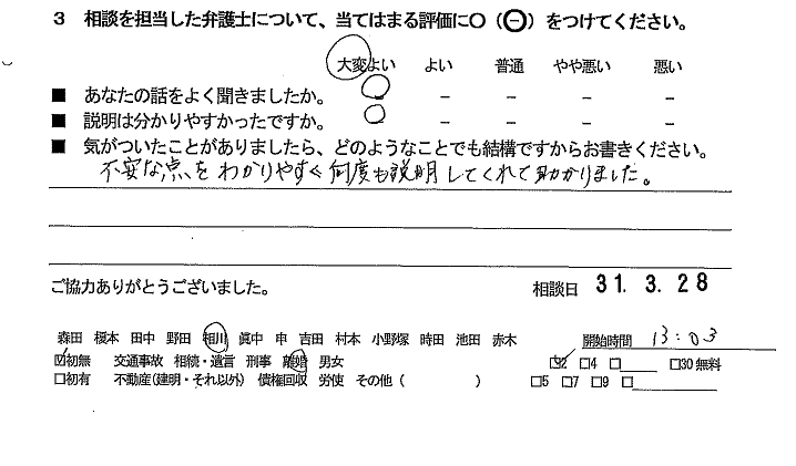 お客様の声(ご相談者の声)評判・口コミ 公開日:2019/04/11 お客様の声 ご相談者の声 不安な点をわかりやすく何度も説明してくれて助かりました。 ■あなたの話をよく聞きましたか:大変よい ■説明はわかりやすかったですか:大変よい 「お客様の声(ご相談者の声)評判・口コミ」 「お客様の声(ご相談者の声)評判・口コミ」
