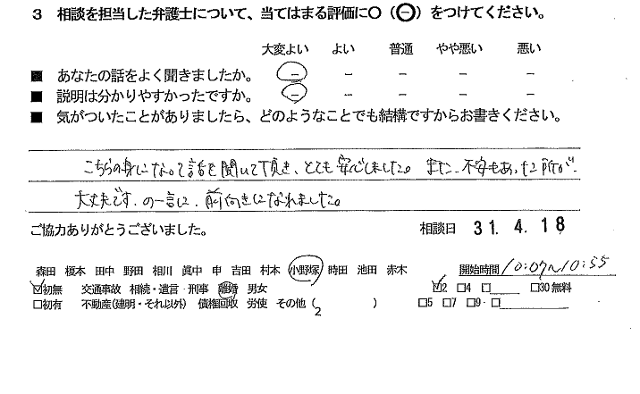 こちらの身になって話を聞いて頂き、とても安心しました。また、不安があった所が、大丈夫です、の一言に、前向きになれました。