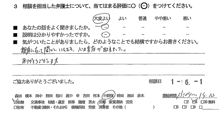 お客様の声(ご相談者の声)評判・口コミ 公開日:2019/07/04 お客様の声 ご相談者の声 親身になって聞いていただき、心の重荷が取れました。ありがとうございます。 ■あなたの話をよく聞きましたか:大変よい ■説明はわかりやすかったですか:大変よい 「お客様の声(ご相談者の声)評判・口コミ」 「お客様の声(ご依頼者の声)評判・口コミ」