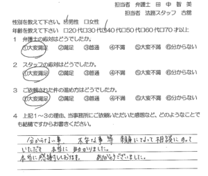お客様の声(ご依頼者の声)評判・口コミ 公開日:2020/01/16 お客様の声 ご依頼者の声 分からない事、不安な事等親身になって相談にのっていただき本当に助かりました。本当に感謝しております。ありがとうございました。 1 弁護士の対応はどうでしたか:大変満足 2 スタッフの対応はどうでしたか:大変満足 3 ご依頼された件の進め方はどうでしたか:大変満足 「お客様の声(ご相談者の声)評判・口コミ」 「お客様の声(ご相談者の声)評判・口コミ」