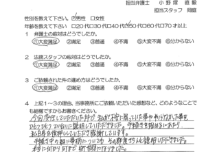 今回、受任していただいた件で、私が不安に思っていた事や判らなかった事をひとつひとつていねいに説明していただきました。手続きを始めるにあたり、私自身を後押ししていただき感謝しています。手続き中の細い事柄についてもその都度きちんと説明いただきました。本当に何から何まで御世話になりました。