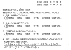 お客様の声(ご依頼者の声)評判・口コミ 公開日:2021/12/18 お客様の声 ご依頼者の声 とても細かい対応をしていただき大変助かりました。ありがとうございました。 1 弁護士の応対はどうでしたか:大変満足 2 スタッフの応対はどうでしたか:大変満足 3 ご依頼された件の進め方はどうでしたか:大変満足 「お客様の声(ご依頼者の声)評判・口コミ」 「お客様の声(ご依頼者の声)評判・口コミ」