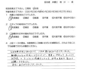公正証書作成にあたりまして、ご尽力頂きありがとうございました。離婚してからの作成となりましたが、無事に終わってホッとしております。又、ナーバスな問題でしたので、女性の先生で安心してお願いできました。本当にありがとうございました。