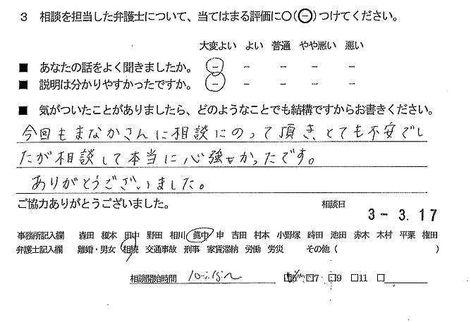 お客様の声(ご相談者の声)評判・口コミ 公開日:2021/04/08 お客様の声 ご相談者の声 今回もまなかさんに相談にのって頂き、とても不安でしたが相談して本当に心強かったです。ありがとうございました。 ■あなたの話をよく聞きましたか:大変よい ■説明はわかりやすかったですか:大変よい 「お客様の声(ご相談者の声)評判・口コミ」 「お客様の声(ご相談者の声)評判・口コミ」