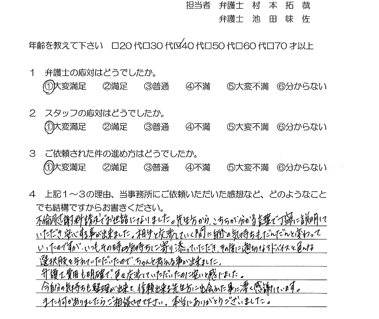 不倫慰謝料請求でお世話になりました。先生方から、こちらが分かる言葉で丁寧に説明していただき、安心する事が出来ました。相手と交渉していく間に自分の気持ちもだんだんと変わっていったのですが、いつもその時の気持ちに寄り添っていただき、その度に適切なアドバイスと色んな選択肢を与えていただいたので、ちゃんと考える事が出来ました。弁護士費用も明確で、色々交渉していただいたのに安いと感じました。今自分の気持ちも整理が出来て、信頼出来る先生方に出会えた事に凄く感謝しています。また何かありましたら、ご相談させて下さい。本当にありがとうございました。