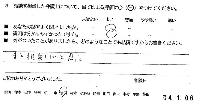 お客様の声(ご相談者の声)評判・口コミ 公開日:2022/04/08 お客様の声 ご相談者の声 また相談したいと思った ■あなたの話をよく聞きましたか:よい ■説明は分かりやすかったですか:よい 「お客様の声(ご相談者の声)評判・口コミ」 「お客様の声(ご相談者の声)評判・口コミ」