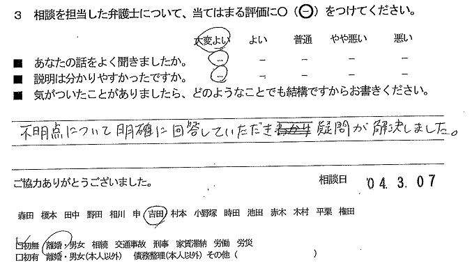 お客様の声(ご相談者の声)評判・口コミ 公開日:2022/05/18 お客様の声 ご相談者の声 不明点について明確に回答していただき疑問が解決しました。 ■あなたの話をよく聞きましたか:大変良い ■説明は分かりやすかったですか:大変良い 「お客様の声(ご相談者の声)評判・口コミ」 「お客様の声(ご相談者の声)評判・口コミ」