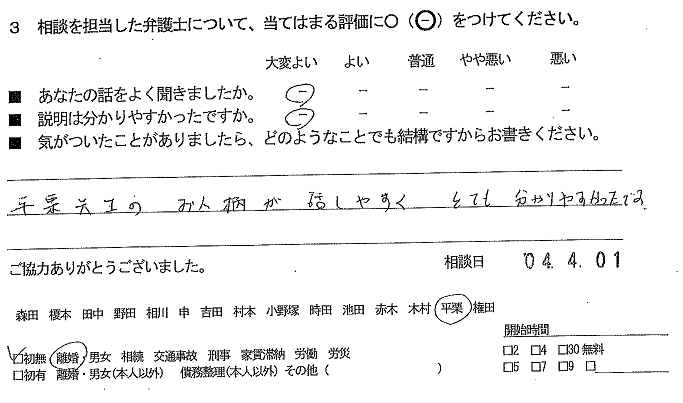 お客様の声(ご相談者の声)評判・口コミ 公開日:2022/05/25 お客様の声 ご相談者の声 平栗先生のお人柄が話しやすく、とても分かりやすかったです。 ■あなたの話をよく聞きましたか:大変よい ■説明は分かりやすかったですか:大変よい 「お客様の声(ご相談者の声)評判・口コミ」 「お客様の声(ご相談者の声)評判・口コミ」