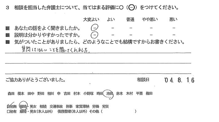 お客様の声(ご相談者の声)評判・口コミ 公開日:2022/10/01 お客様の声 ご相談者の声 質問してほしいことを聞いてくれました。 ■あなたの話をよく聞きましたか:大変よい ■説明は分かりやすかったですか:大変よい 「お客様の声(ご相談者の声)評判・口コミ」 「お客様の声(ご相談者の声)評判・口コミ」