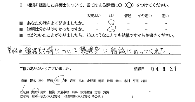 お客様の声(ご相談者の声)評判・口コミ 公開日:2022/10/05 お客様の声 ご相談者の声 男性の親権取得について親身に相談にのってくれた。 ■あなたの話をよく聞きましたか:よい ■説明は分かりやすかったですか:よい 「お客様の声(ご相談者の声)評判・口コミ」 「お客様の声(ご相談者の声)評判・口コミ」