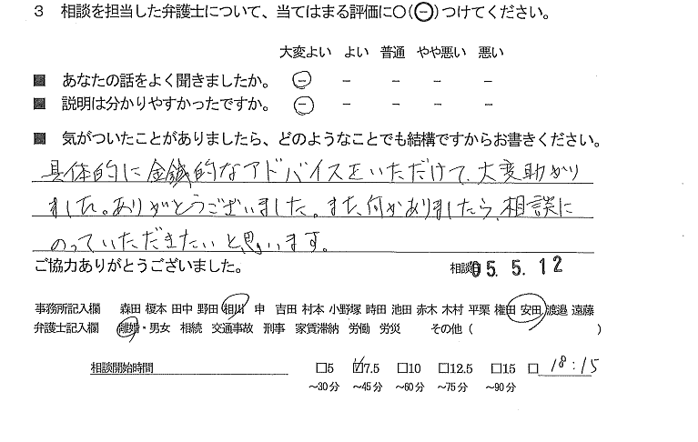 お客様の声(ご相談者の声)評判・口コミ 公開日:2023/07/03 お客様の声 ご相談者の声 具体的に金銭的なアドバイスをいただけて、大変助かりました。ありがとうございました。また何かありましたら、相談にのっていただきたいと思います。 ■あなたの話をよく聞きましたか:大変よい ■説明はわかりやすかったですか:大変よい 「お客様の声(ご相談者の声)評判・口コミ」 「お客様の声(ご相談者の声)評判・口コミ」