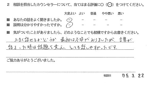 お客様の声(ご相談者の声)評判・口コミ 公開日:2023/05/01 お客様の声 ご相談者の声 上手く話せるかどうか、最初は不安がありましたが、言葉が詰まった時は話題を変え、とても話しやすかったです。 ■あなたの話をよく聞きましたか:大変よい ■説明はわかりやすかったですか:大変よい 「お客様の声(ご相談者の声)評判・口コミ」 「お客様の声(ご相談者の声)評判・口コミ」