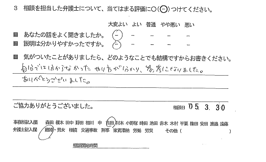 お客様の声(ご相談者の声)評判・口コミ 公開日:2023/05/01 お客様の声 ご相談者の声 自分では分からなかったやり方が分かり、参考になりました。ありがとうございました。 ■あなたの話をよく聞きましたか:大変よい ■説明はわかりやすかったですか:大変よい 「お客様の声(ご相談者の声)評判・口コミ」 「お客様の声(ご相談者の声)評判・口コミ」
