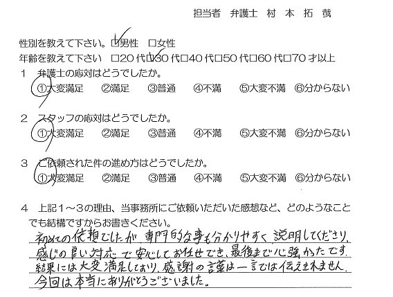 お客様の声(ご依頼者の声)評判・口コミ 公開日:2023/07/03 お客様の声 ご依頼者の声 初めての依頼でしたが、専門的なことも分かりやすく説明してくださり、感じの良い対応で安心してお任せでき、最後まで心強かったです。 結果には大変満足しており、感謝の言葉は一言では伝えきれません。 今回は本当にありがとうございました。 1 弁護士の応対はどうでしたか:大変満足 2 スタッフの応対はどうでしたか:大変満足 3 ご依頼された件の進め方はどうでしたか:大変満足 「お客様の声(ご相談者の声)評判・口コミ」 「お客様の声(ご依頼者の声)評判・口コミ」