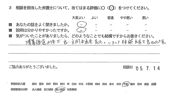 お客様の声(ご相談者の声)評判・口コミ 公開日:2023/09/12 お客様の声 ご相談者の声 清算価値の件で良い方向に出来ました。 いろいろ相談できて良かったです。 ■あなたの話をよく聞きましたか:大変よい ■説明はわかりやすかったですか:大変よい 「お客様の声(ご相談者の声)評判・口コミ」 「お客様の声(ご相談者の声)評判・口コミ」