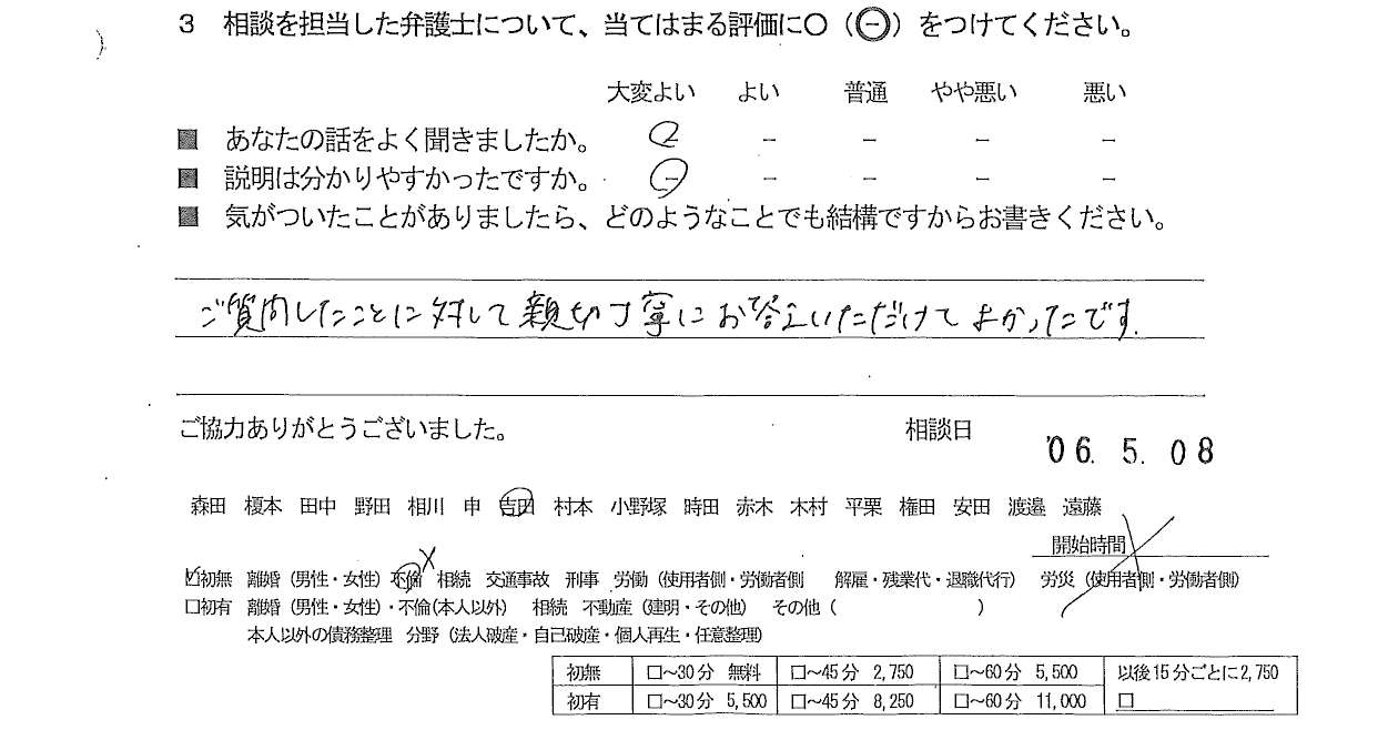 お客様の声(ご相談者の声)評判・口コミ 公開日:2024/06/17 お客様の声 ご相談者の声 ■年代 ■担当弁護士 ■あなたの話をよく聞きましたか ■説明はわかりやすかったですか - 吉田竜二 大変よい 大変よい ご質問したことに対して親切丁寧にお答えいただけてよかったです。 「お客様の声(ご相談者の声)評判・口コミ」 「お客様の声(ご相談者の声)評判・口コミ」