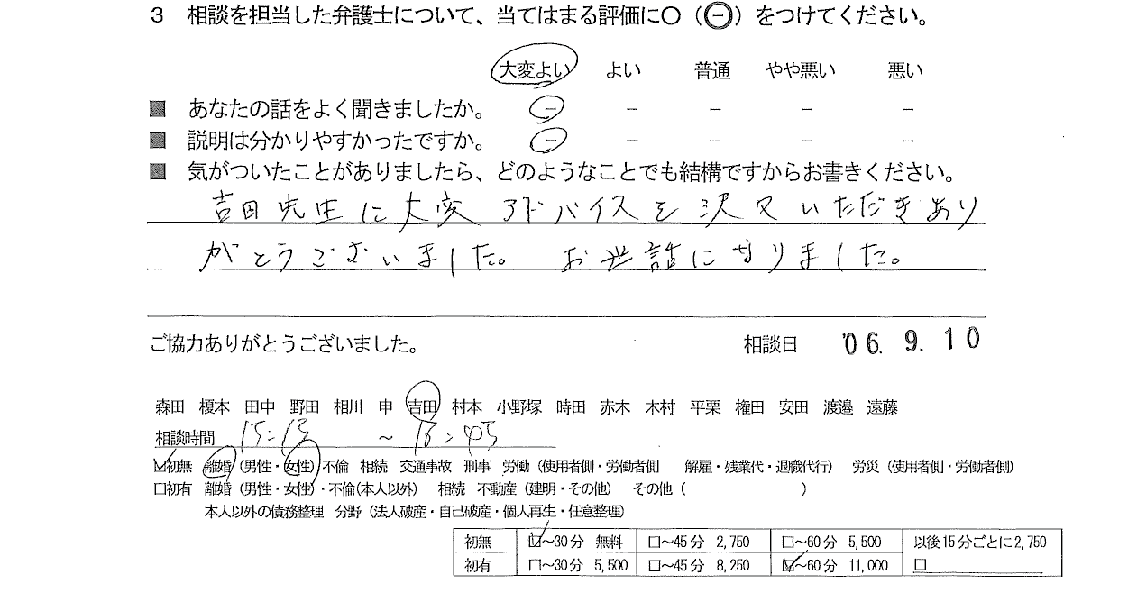 お客様の声(ご相談者の声)評判・口コミ 公開日:2024/10/17 お客様の声 ご相談者の声 ■年代 ■担当弁護士 ■あなたの話をよく聞きましたか ■説明はわかりやすかったですか - 吉田 竜二 大変よい 大変よい 吉田先生に大変アドバイスを沢々いただきありがとうございました。お世話になりました。 「お客様の声(ご相談者の声)評判・口コミ」 「お客様の声(ご相談者の声)評判・口コミ」