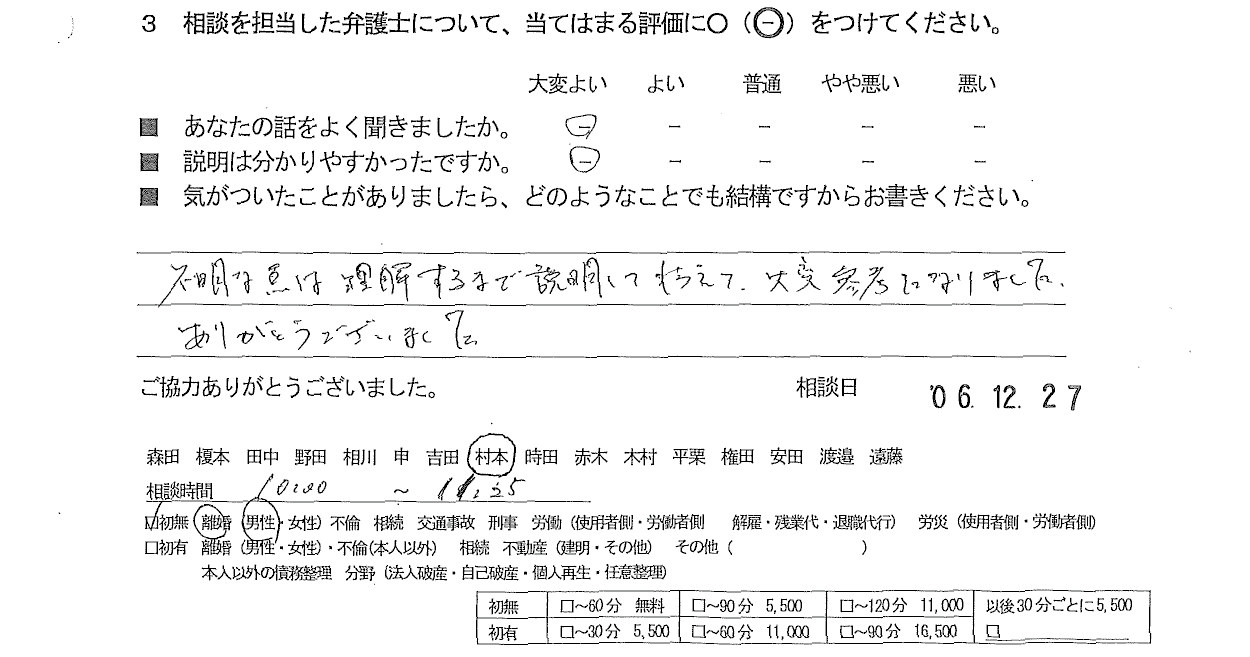 お客様の声(ご相談者の声)評判・口コミ 公開日:2025/01/23 お客様の声 ご相談者の声 ■年代 ■担当弁護士 ■あなたの話をよく聞きましたか ■説明はわかりやすかったですか - 村本拓哉 大変よい 大変よい 不明な点は理解するまで説明してもらえて、大変参考になりました。ありがとうございました。 「お客様の声(ご依頼者の声)評判・口コミ」 「お客様の声(ご相談者の声)評判・口コミ」