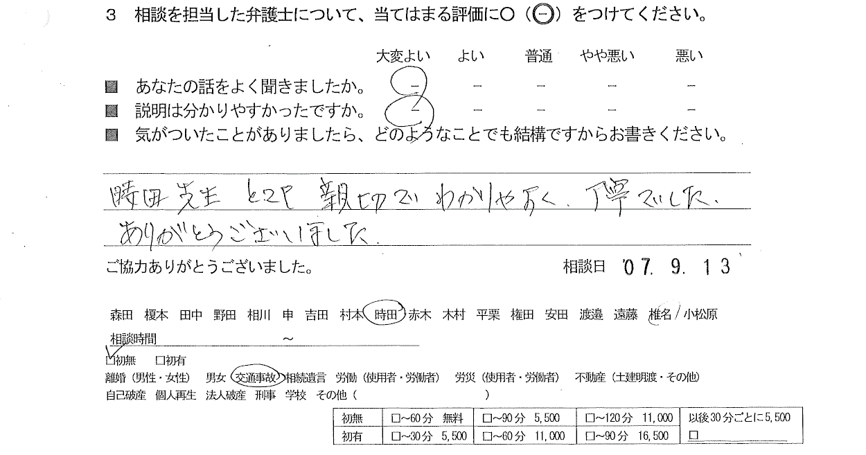 お客様の声(ご相談者の声)評判・口コミ 公開日:2025/10/23 お客様の声 ご相談者の声 ■年代 ■担当弁護士 ■あなたの話をよく聞きましたか ■説明はわかりやすかったですか - 時田 剛志 大変よい 大変よい 時田先生とても親切でわかりやすく、丁寧でした。ありがとうございました。 「お客様の声(ご相談者の声)評判・口コミ」 「お客様の声(ご依頼者の声)評判・口コミ」
