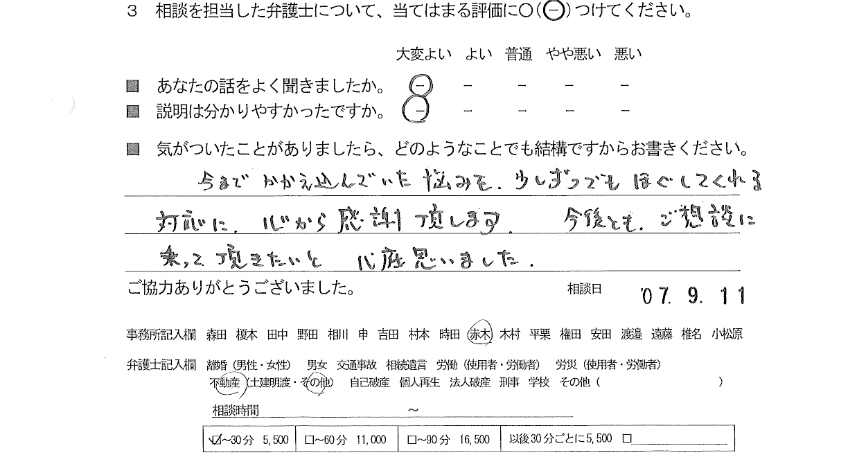 今までかかえ込んでいた悩みを、少しずつでもほぐしてくれる対応に、心から感謝致します。 今後とも、ご相談に乗って頂きたいと心底思いました。