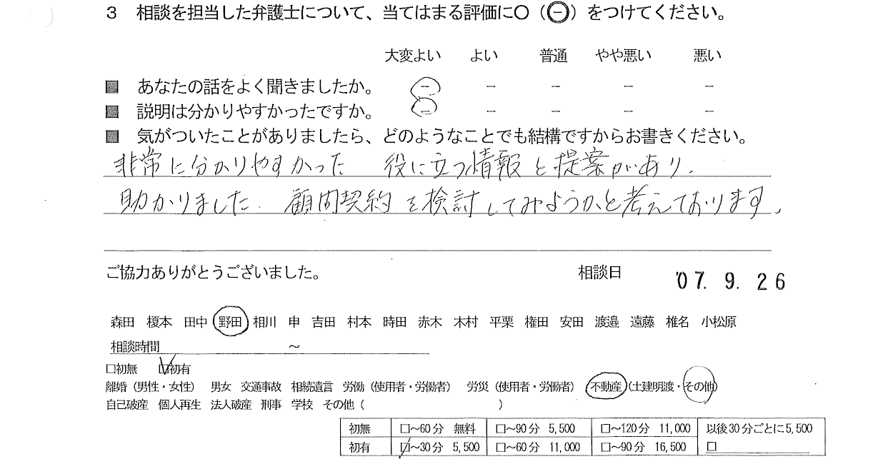 非常に分かりやすかった。役に立つ情報と提案があり、助かりました。 顧問契約を検討してみようかと考えております。