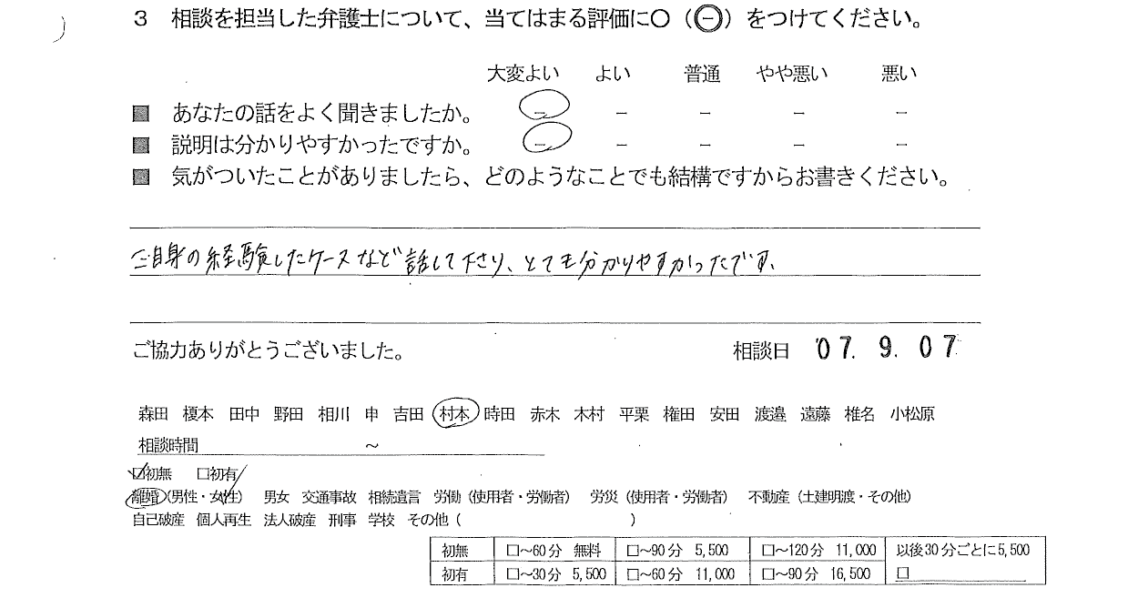 お客様の声(ご相談者の声)評判・口コミ 公開日:2025/10/27 お客様の声 ご相談者の声 ■年代 ■担当弁護士 ■あなたの話をよく聞きましたか ■説明はわかりやすかったですか - 村本 拓哉 大変よい 大変よい ご自身の経験したケースなど話して下さり、とても分かりやすかったです。 「お客様の声(ご相談者の声)評判・口コミ」 「お客様の声(ご相談者の声)評判・口コミ」