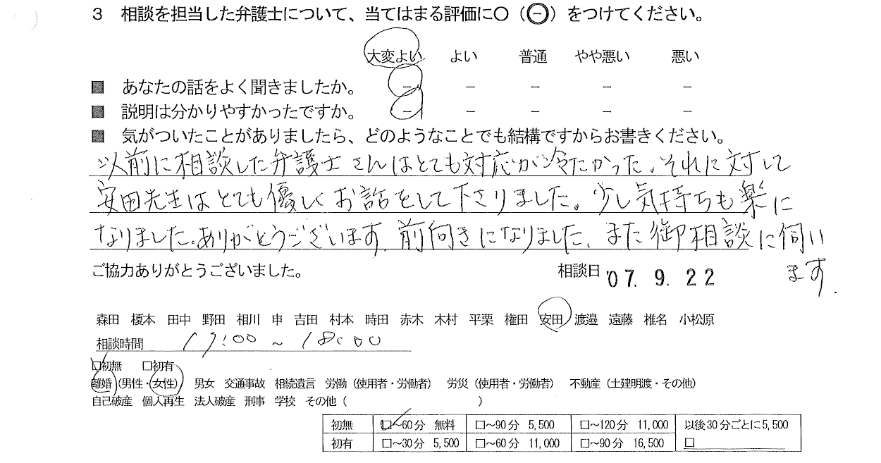 以前に相談した弁護士さんはとても対応が冷たかった。 それに対して安田先生はとても優しくお話をして下さりました。 少し気持ちも楽になりました。 ありがとうございます。前向きになりました。 また御相談に伺います。