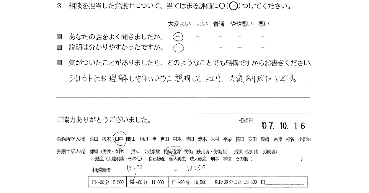 お客様の声(ご相談者の声)評判・口コミ 公開日:2025/11/17 お客様の声 ご相談者の声 ■年代 ■担当弁護士 ■あなたの話をよく聞きましたか ■説明はわかりやすかったですか - 田中 智美 大変よい 大変よい シロウトにも理解しやすいように説明して下さり、大変ありがたいです。 「お客様の声(ご相談者の声)評判・口コミ」 「お客様の声(ご相談者の声)評判・口コミ」