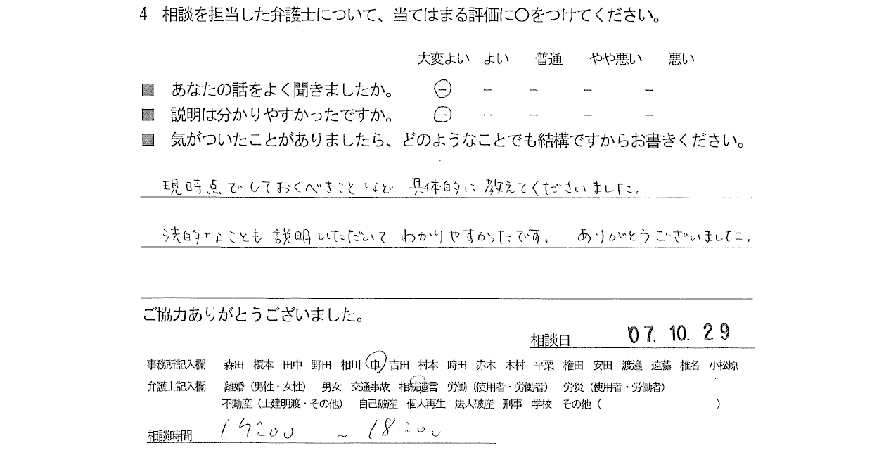 現時点でしておくべきことなど 具体的に教えてくだいました。 法的なことも説明していただいて わかりやすかったです。 ありがとうございました。
