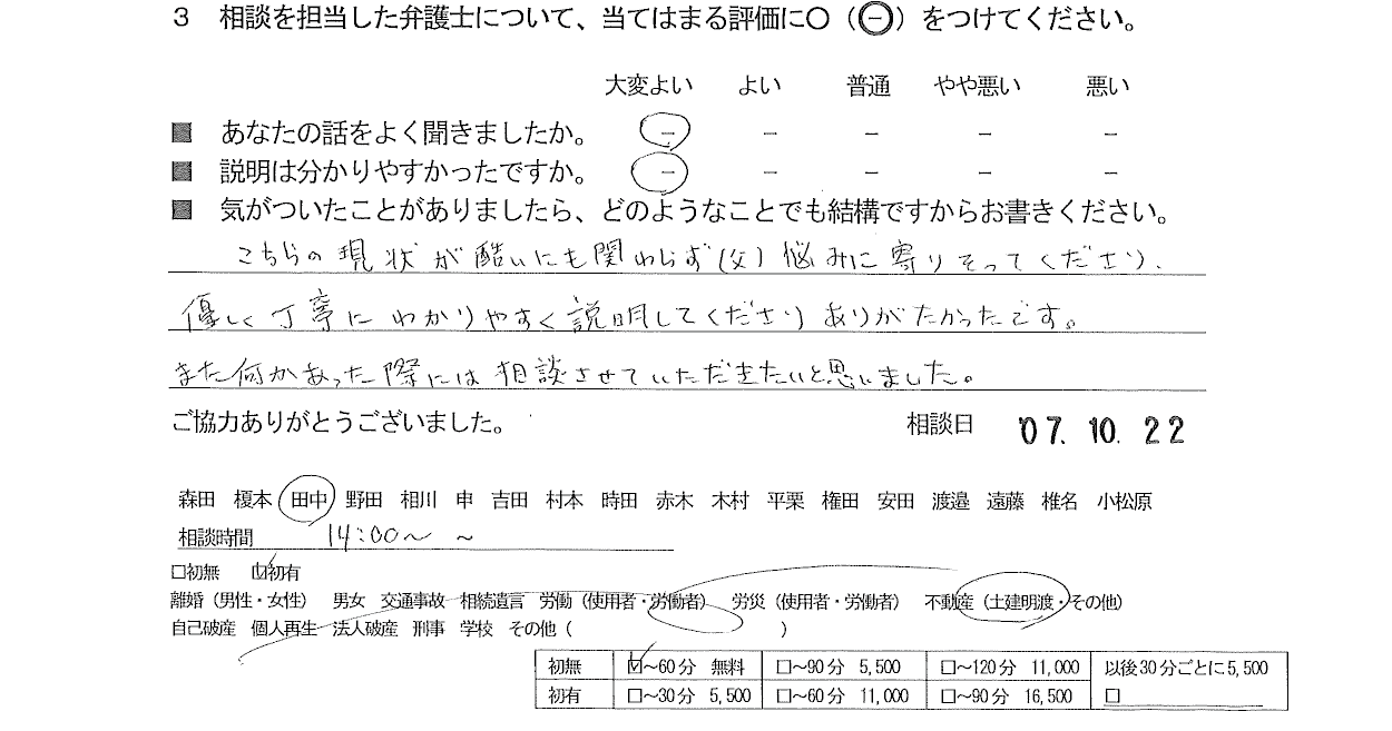 こちらの現状が酷いにも関わらず(父)悩みに寄りそってくださり、優しく丁寧にわかりやすく説明してくださりありがたかったです。また何かあった際には相談させていただきたいと思いました。