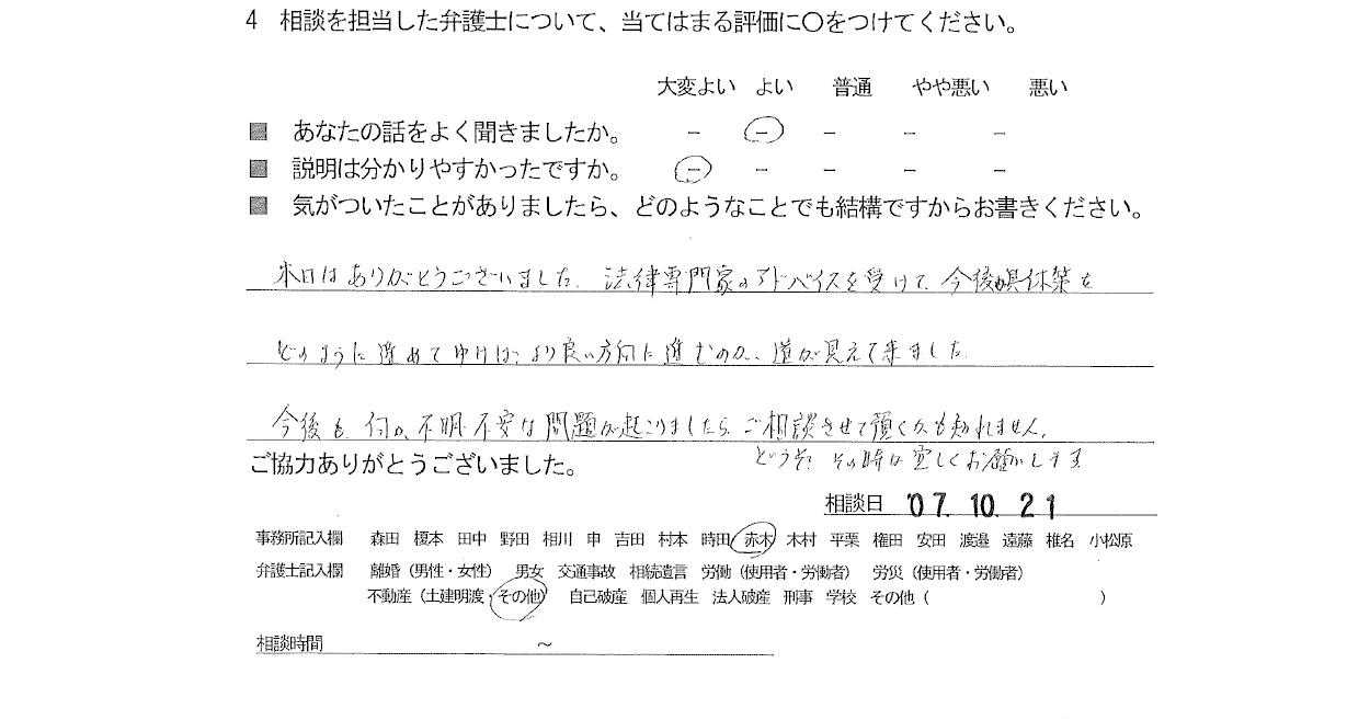 本日はありがとうございました。法律専門家のアドバイスを受けて、今後の具体策をどのように進めてゆけば、より良い方向に進むのか、道が見えて来ました。 今後も何か、不明・不安な問題が起こりましたら、ご相談させて頂くかも知れません。 どうぞ、その時は宜しくお願いします。