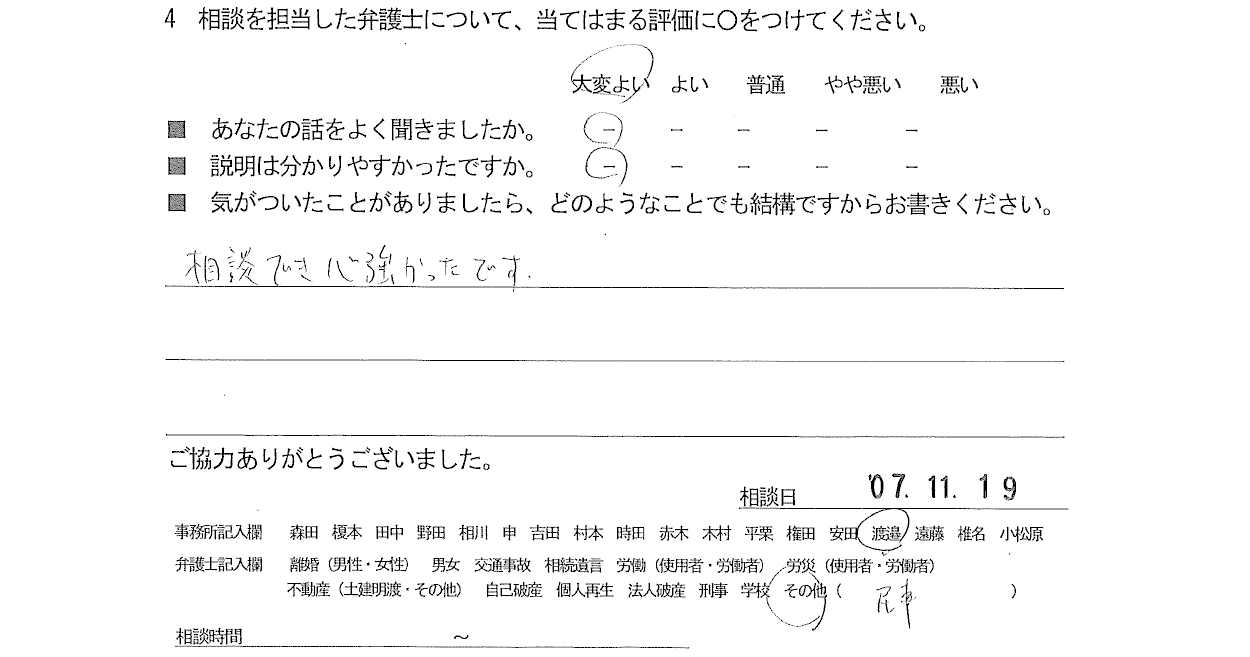 お客様の声(ご相談者の声)評判・口コミ 公開日:2025/12/22 お客様の声 ご相談者の声 ■年代 ■担当弁護士 ■あなたの話をよく聞きましたか ■説明はわかりやすかったですか - 渡邉 千晃 大変よい 大変よい 相談でき心強かったです。 「お客様の声(ご相談者の声)評判・口コミ」 「お客様の声(ご相談者の声)評判・口コミ」