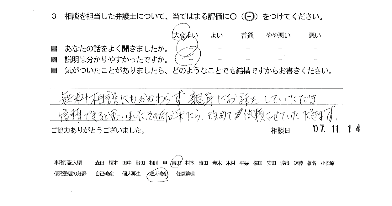 無料相談にもかかわらず親身にお話をしていただき 信頼できると思いました。 その時が来たら、改めて依頼させていただきます。