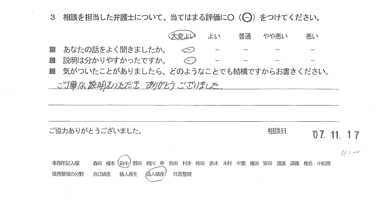 お客様の声(ご相談者の声)評判・口コミ 公開日:2025/12/22 お客様の声 ご相談者の声 ■年代 ■担当弁護士 ■あなたの話をよく聞きましたか ■説明はわかりやすかったですか - 田中 智美 大変よい 大変よい ご丁寧な説明をいただき、ありがとうございました。 「お客様の声(ご相談者の声)評判・口コミ」 「お客様の声(ご相談者の声)評判・口コミ」