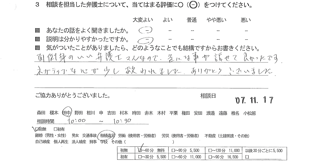 面倒見のいい弁護士さんなので、色んな事が話せて良かったです。 ネガティブな心が少し救われました。ありがとうございました。