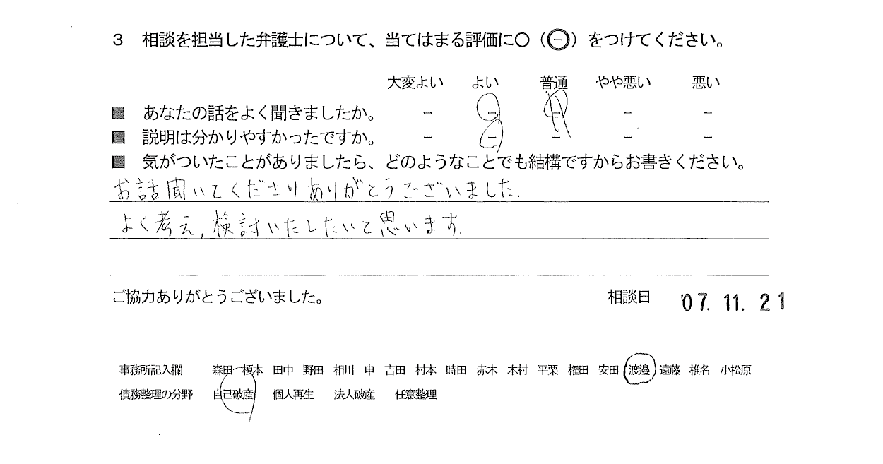 お話聞いてくださりありがとうございました。よく考え、検討いたしたいと思います。
