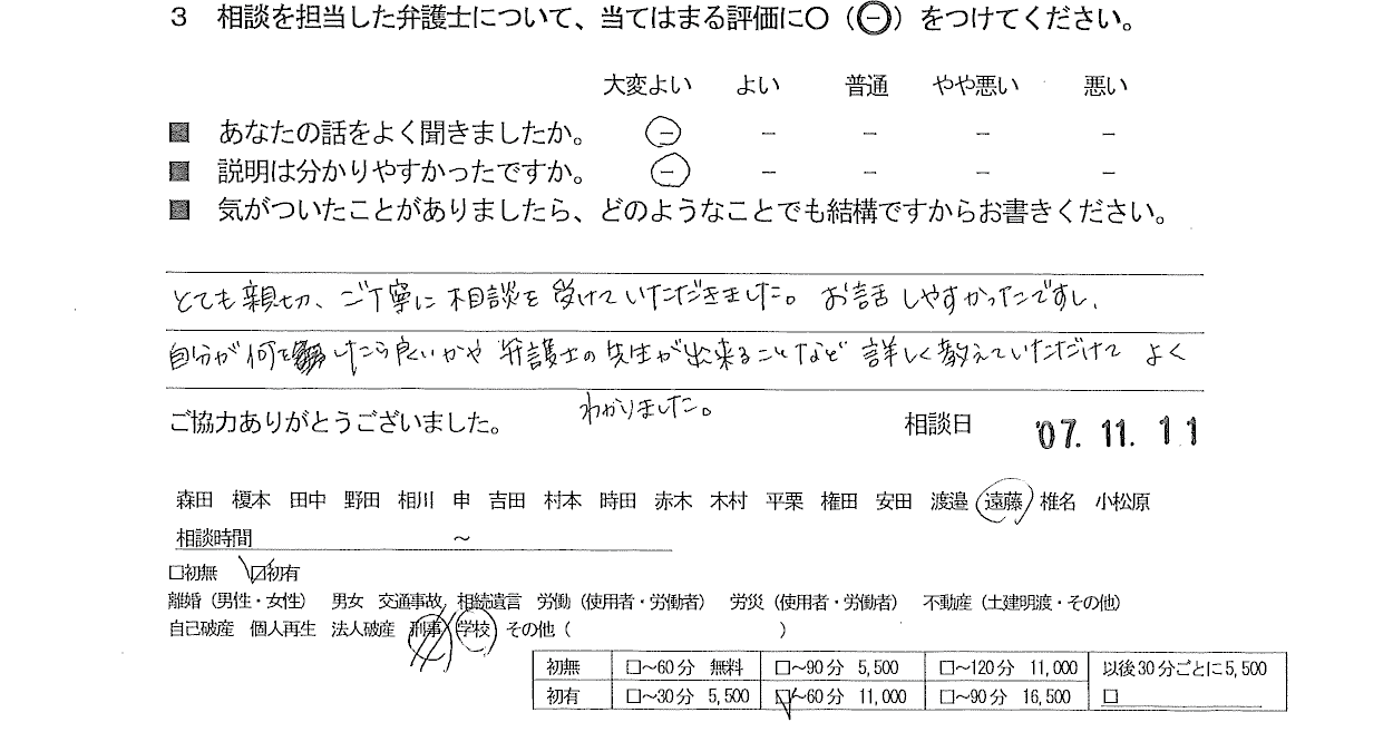 とても親切、ご丁寧に相談を受けていただきました。 お話しやすかったですし、自分が何をしたら良いかや弁護士の先生が出来ることなど詳しく教えていただけてよく分かりました。