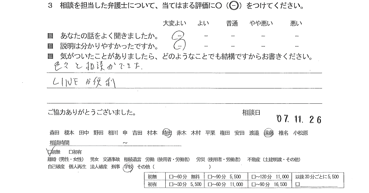 お客様の声(ご相談者の声)評判・口コミ 公開日:2025/12/23 お客様の声 ご相談者の声 ■年代 ■担当弁護士 ■あなたの話をよく聞きましたか ■説明はわかりやすかったですか - 時田 剛志・遠藤 吏恭 大変よい 大変よい 色々と相談ができた。LINEが便利。 「お客様の声(ご相談者の声)評判・口コミ」 「お客様の声(ご相談者の声)評判・口コミ」