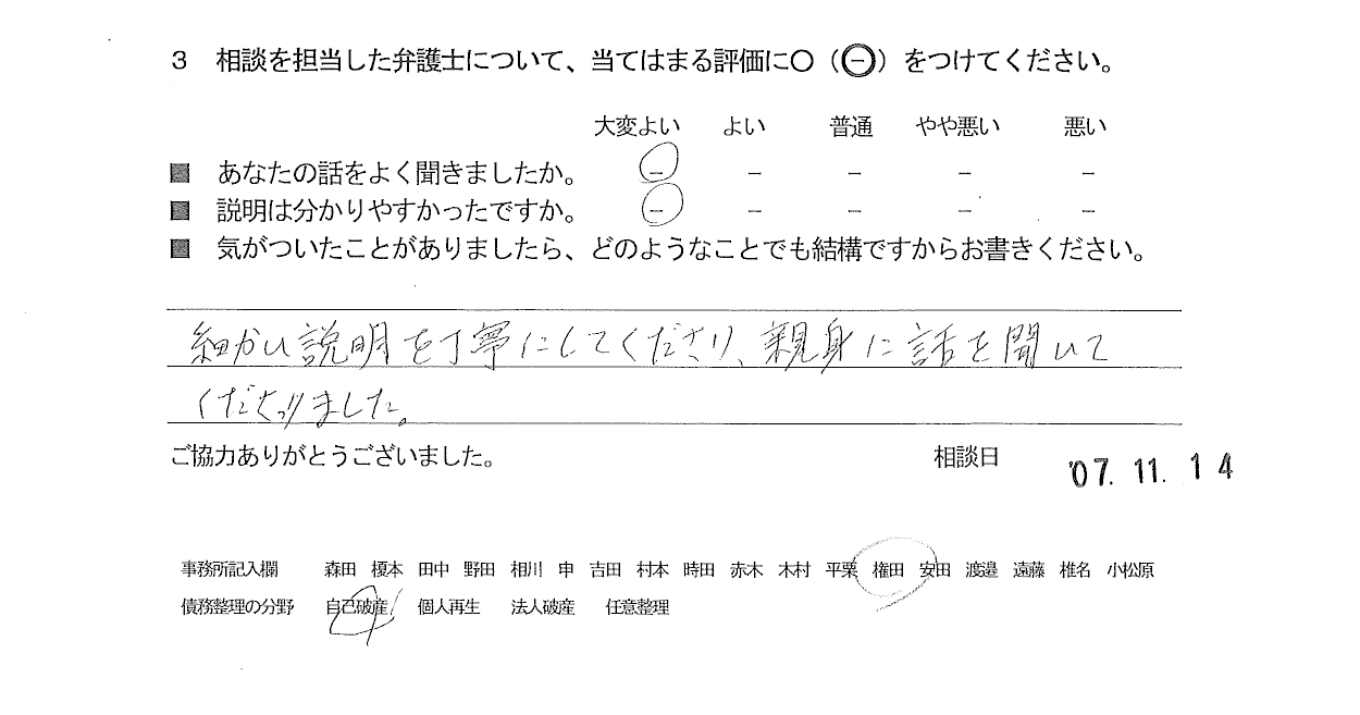 お客様の声(ご相談者の声)評判・口コミ 公開日:2025/12/23 お客様の声 ご相談者の声 ■年代 ■担当弁護士 ■あなたの話をよく聞きましたか ■説明はわかりやすかったですか - 権田 健一郎 大変よい 大変よい 細かい説明を丁寧にしてくださり、親身に話を聞いてくださりました。 「お客様の声(ご相談者の声)評判・口コミ」 「お客様の声(ご相談者の声)評判・口コミ」