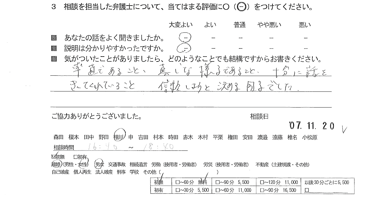 お客様の声(ご相談者の声)評判・口コミ 公開日:2025/12/26 お客様の声 ご相談者の声 ■年代 ■担当弁護士 ■あなたの話をよく聞きましたか ■説明はわかりやすかったですか - 相川 一ゑ 大変よい 大変よい 率直であること、真摯な様子であること、十分に話をきいてくれていること 信頼しようと決める因子でした。 「お客様の声(ご相談者の声)評判・口コミ」 「お客様の声(ご相談者の声)評判・口コミ」
